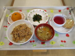 納豆丼・ほうれん草の胡麻和え・さつま汁・みかん ~おやつ~ぶどうゼリー・おせんべい・牛乳