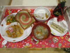 ミートグラタン・クリスマスサラダ・ポトフ・クリスマス野菜パン・フルーツヨーグルト ~おやつ~デコレーションケーキ・紅茶